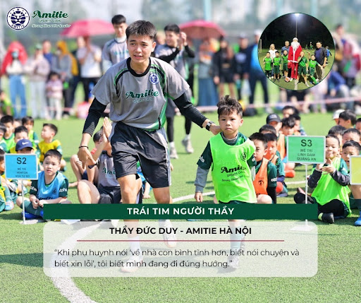 “Hạnh phúc nhất của người thầy tại Amitie là khi nghe phụ huynh nói: ‘Về nhà con bình tĩnh hơn, biết nói chuyện và biết xin lỗi.” Khi thấy trẻ thay đổi trong đời sống hằng ngày, tôi biết mình đang đi đúng hướng. Tôi mong phụ huynh cảm nhận được rằng con không chỉ đang học bóng đá, mà đang học cách đối diện cảm xúc, vượt qua thất bại và tinh thần tập thể. Mỗi buổi học là một trải nghiệm để con trưởng thành, không chỉ trên sân mà cả ngoài đời.” – Thầy Đức Duy chia sẻ.